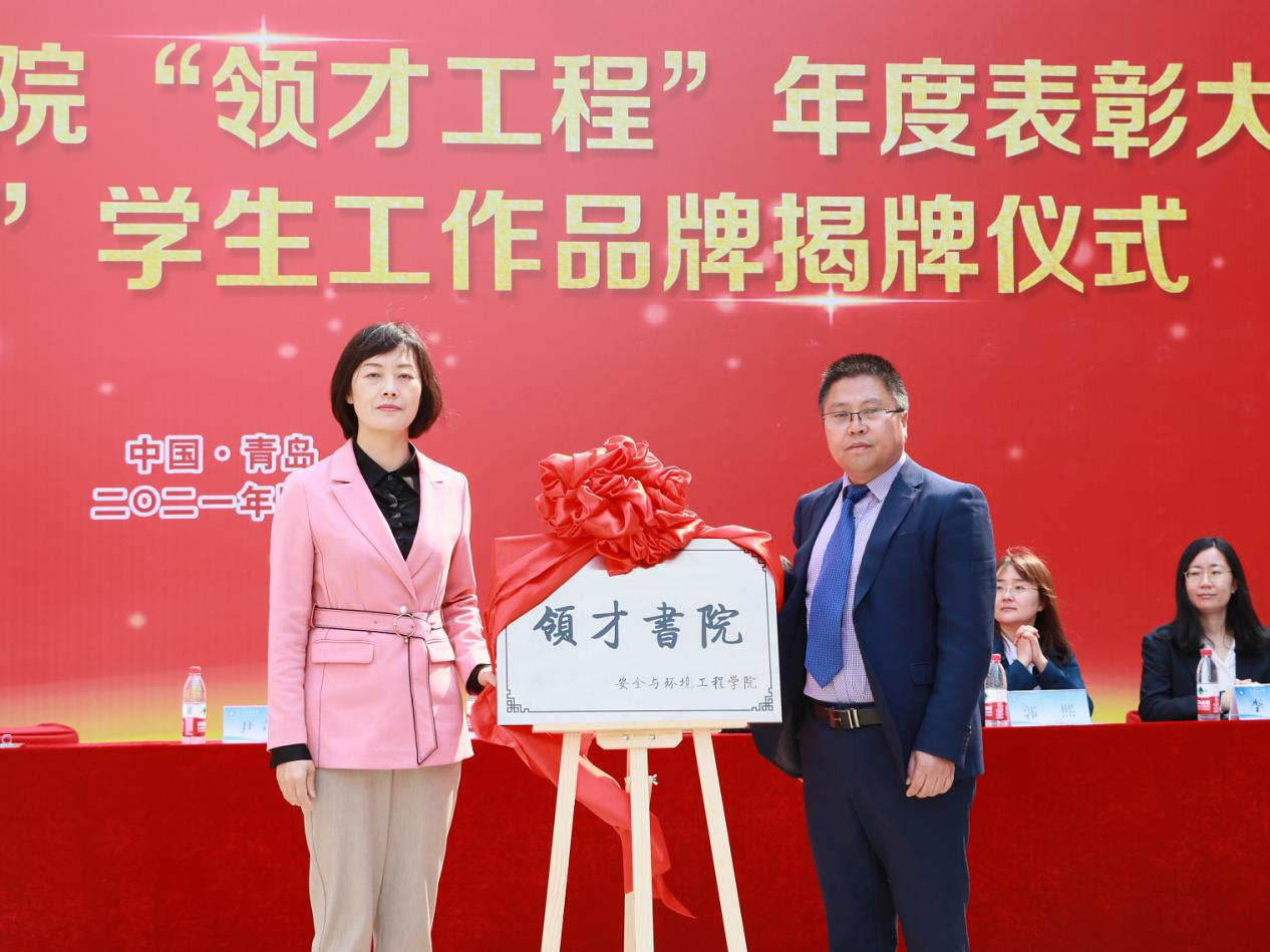 校团委书记尹立明、学生工作处副处长孔环与学院党委书记张恩生、党委副书记兼副院长王建友为“五色生花”学生工作品牌和“领才书院”一站式社区揭牌。