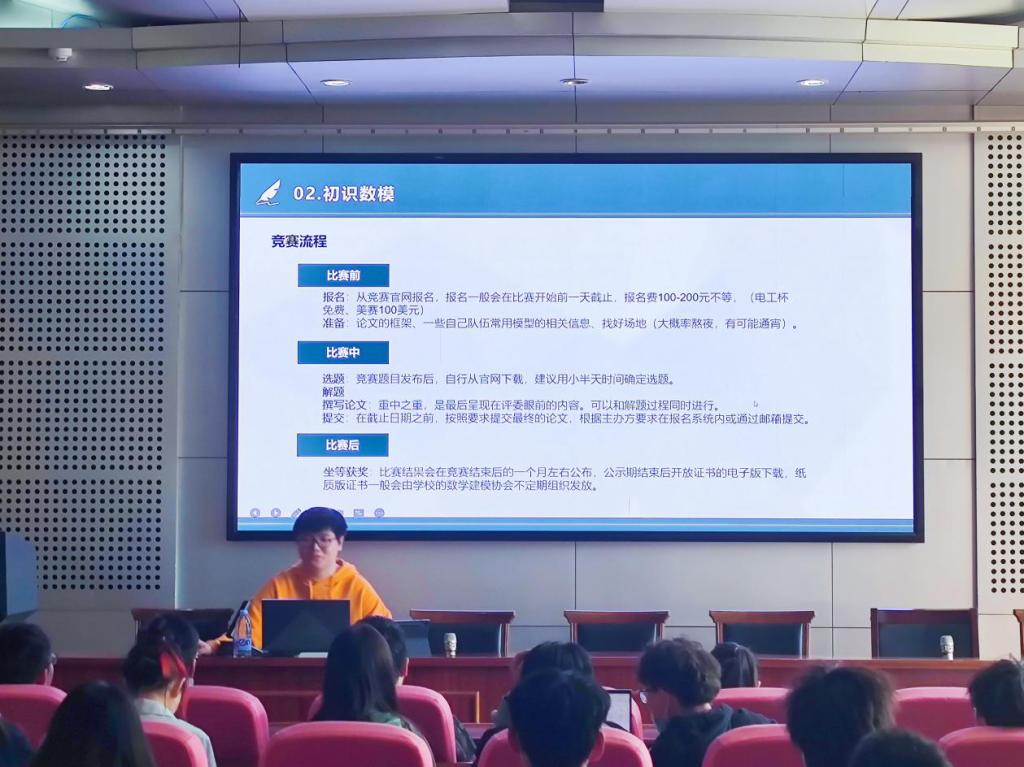 会上,李晨以比赛流程、论文结构和参赛具备的能力等为主线进行了重点讲解,用简单的例子生动形象地解答了什么是数学建模、为什么要建模的问题,向同学们阐释了数学建模在众多领域的重要性。他在讲解过程中列举了一系列优秀参赛作品的例子,并结合自己的亲身经历,向同学们展示了如何利用学校资源和条件帮助自己备赛,如何在组队和“单飞”之间做抉择等,为同学们现场解答了有关疑问。