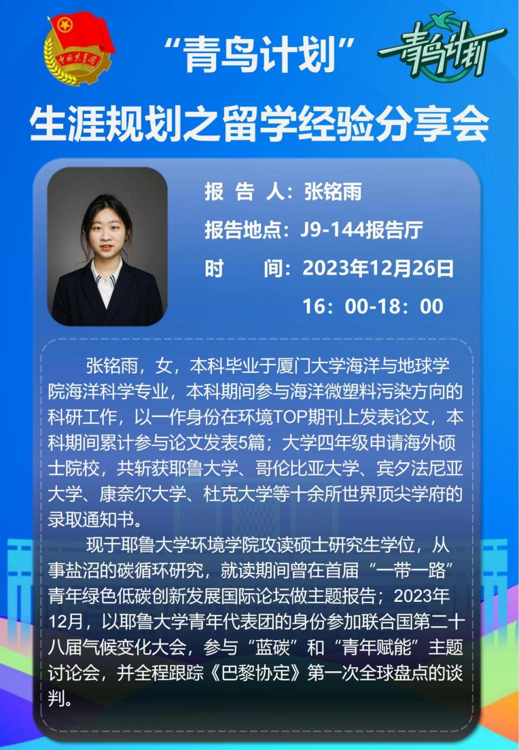 点击:为服务学生学业发展、拓展国际视野、更好规划学习生活,12月26日,第一版主 在J9-144报告厅举办“青鸟计划-生涯规划之留学经验分享会”。本次分享会由耶鲁大学硕士研究生张铭雨主讲,第一版主 部分本科生参加。