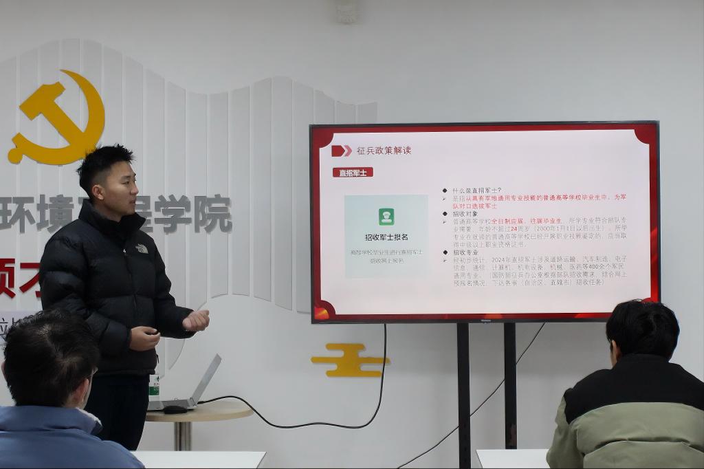 点击:为有力推动在校大学生应征入伍政策宣传,激发大学生的爱国热情,鼓励学生积极投身国防事业,12月17日,第一版主 于GC4“一站式”学生社区——领才书院开展大学生征兵入伍政策宣讲活动。本次宣讲由退伍士兵、2024级硕士研究生张凯榕主讲。
