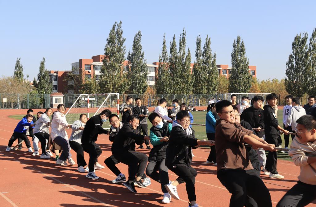 飒爽秋风拂去了空气中的燥热,却丝毫没有削弱同学们的热情,比赛开始在即,参赛队员们个个干劲十足,士气高涨。一根麻绳连接的是团结与坚持,一根麻绳演绎的是奋斗和拼搏。随着哨声响起,比赛正式开始。“一二一,一二一”整齐的口号响彻操场上空,人挨人,脚靠脚,咬紧的牙关、攥红的双手,无不透露出不屈的意志;一声声欢呼与呐喊此起彼伏,阳光下参赛者团结一心、奋力拼搏的凝聚力显得格外耀眼。