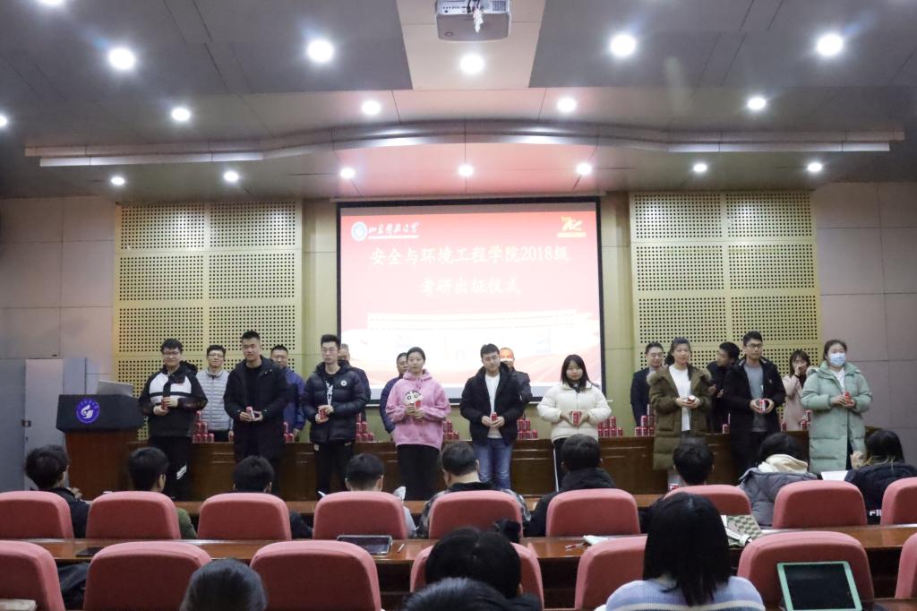 点击:12月22日,第一版主 在J4-101报告厅举行2018级考研出征仪式。学院党委书记张恩生、党委副书记兼副院长王建友、副院长刘音、副院长聂文、应急系主任孟祥豹、环境系主任胡术刚、班主任代表张林林、团委书记潘刚、辅导员郭熙参加出征仪式并为考研学生送上祝福。