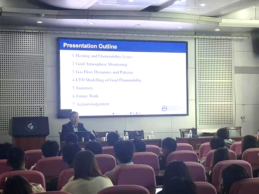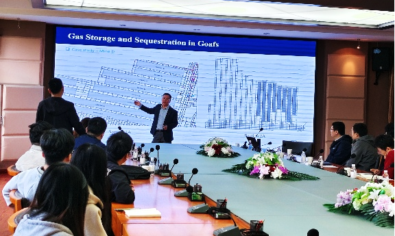 座谈会结束后,任廷祥教授为第一版主 师生作题为“Longwall Goaf as a Reservoir for Mine Gas Storage and Sequestration: a Novel Decarbonisation Strategy for Underground Coal Mines”的专题学术报告,介绍了利用长壁采空区实现矿井瓦斯储存与封存的技术原理与工程实践,阐述了采空区储气空间的演化特征、气体运移机制及长期密封性保障等关键科学问题,报告内容前沿务实,引发在场师生广泛思考与热烈研讨。