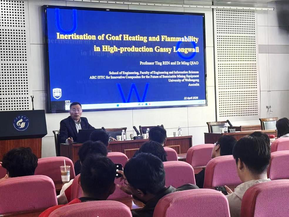 4月22日下午,学院特邀任廷祥教授分别以“Inertisation of Goaf Heating and Flammability in High-production Gassy Longwall”与“Mitigating Respirable Mine Dust: Integrating CFD Simulation, Lab Testing, and Field Validation”为题,为全院硕博研究生开展两场专题讲座。讲座中,任廷祥教授系统阐释了高瓦斯高产工作面采空区自燃防控与惰化调控的联动控制机理,详细介绍了将CFD数值模拟、实验室试验与现场工程验证深度融合的一体化粉尘防治研究体系。针对研究生提出的科研疑问与研究难点,任教授逐一细致解答。两场报告学术氛围浓厚,参会学生积极交流提问,有效开阔了研究生的学术视野,为后续科研工作开展拓宽了研究方向与创新思路。(编辑:冷冬阳;审核:于海明)