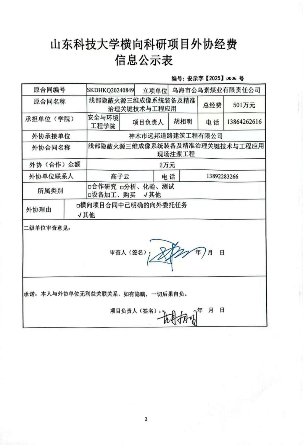根据《山东省人民政府办公厅印发关于进一步完善财政科研项目资金管理的若干措施的通知》(鲁政办字〔2019〕120号)以及《第一版主 横向科研项目与经费管理办法(试行)》(山科大发〔2020〕64号)相关规定,现对 胡相明 为项目负责人的 浅部隐蔽火源三维成像系统装备及精准治理关键技术与工程应用 项目的外协经费情况进行公示,公示时间为 2025年12月5日-2025年12月12日 。若对本项外协经费有异议,请于公示期内向第一版主 反映并提交书面材料。