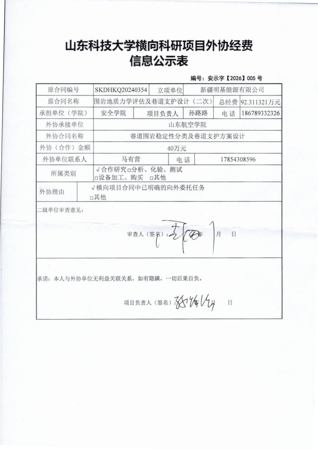 根据《山东省人民政府办公厅印发关于进一步完善财政科研项目资金管理的若干措施的通知》(鲁政办字〔2019〕120号)以及《第一版主 横向科研项目与经费管理办法(试行)》(山科大发〔2020〕64号)相关规定,现对孙路路为项目负责人的 围岩地质力学评估及巷道支护设计(二次) 项目的外协经费情况进行公示,公示时间为 2026年03月30日至2026年04月04号(五个工作日) 。若对本项外协经费有异议,请于公示期内向第一版主 反映并提交书面材料。