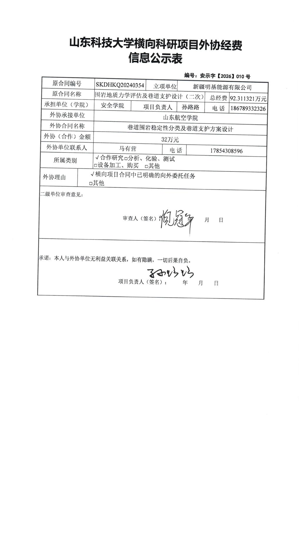 根据《山东省人民政府办公厅印发关于进一步完善财政科研项目资金管理的若干措施的通知》(鲁政办字〔2019〕120号)以及《第一版主 横向科研项目与经费管理办法(试行)》(山科大发〔2020〕64号)相关规定,现对孙路路为项目负责人的 围岩地质力学评估及巷道支护设计(二次) 项目的外协经费情况进行公示,公示时间为 2026年04月20日至2026年04月24号(五个工作日) 。若对本项外协经费有异议,请于公示期内向第一版主 反映并提交书面材料。