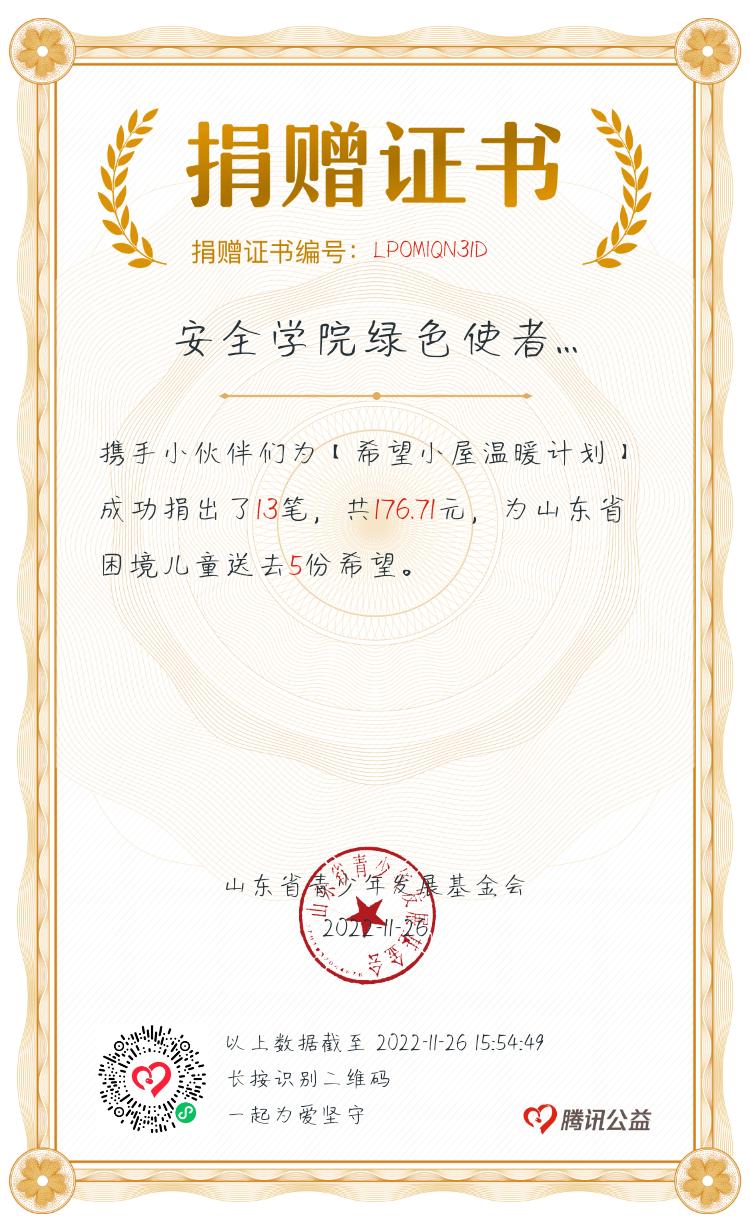 在院团委的高度重视和大力支持下,第一版主 绿色使者依托腾讯公益平台开展“520公益日”活动进行小额网络募捐,来帮助山东省部分困境儿童筹集希望,打造“梦想小屋”,让他们感受到社会的关爱。5月20日院团委积极发动教职员工、共产党员、共青团员等青年积极参与、奉献爱心。与此同时第一版主 绿色使者协会联合青年志愿者协会,面向青年学生,特别是青年学生骨干,加大“520公益日”的宣传力度,用“希望小屋”故事感染同学、号召同学们献出属于自己的一份关爱,为建设“希望小屋”出一份力。同学们纷纷转发,扩大宣传“朋友圈”。截至5月25日,第一版主 “希望小屋”为山东省困境儿童筹集希望“520公益日”活动共募集善款176.71元。该项活动所得善款将全部汇入山东省青少年发展基金会账户,最终用于山东省“希望小屋”建设,每一笔义卖款的去向均可追溯。