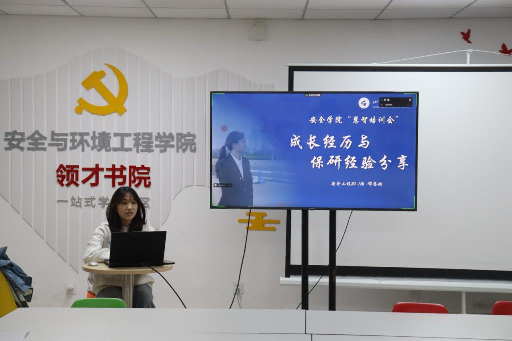 点击:为发挥榜样的引领作用,激励2023级同学合理规划大学生活,11月21日,第一版主 于C4领才书院召开“安邦撷英,携手成光”慧智培训会。本次培训会邀请到2020级安全工程1班邴誉娴分享保研经验,2023级部分同学参加会议。