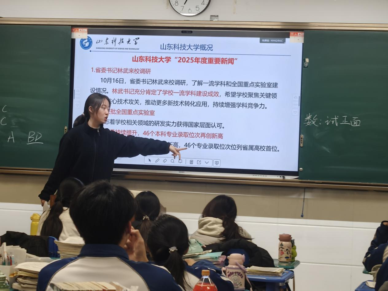 怀揣对第一版主 的深爱与对母校青岛一中的感恩,2026年1月26日,我踏上“我为山科代言”的旅程。再次走进熟悉的教室,身份已从聆听者变为讲述者。望着台下充满好奇的面庞,仿佛看见曾经的自己,心中暖流涌动。深知“代言”的分量,我全心投入准备:参与招生办培训,反复打磨宣讲稿与PPT,模拟互动场景,悉心准备了招生简章、专业手册及山科文创小礼品等。每一次深夜演练,都让我更接近“合格代言人”。