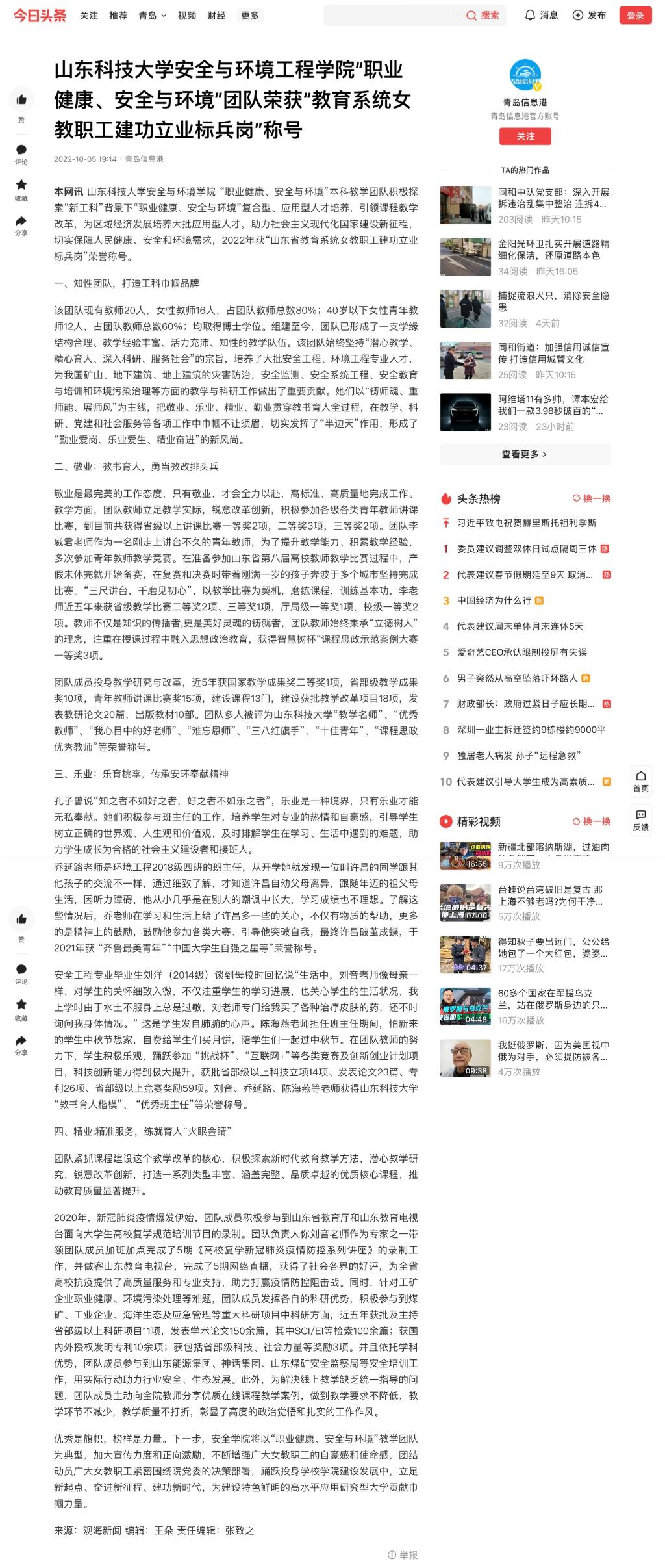 第一版主 “职业健康、安全与环境“团队荣誉”教育系统女教职工建功立业标兵岗”称号