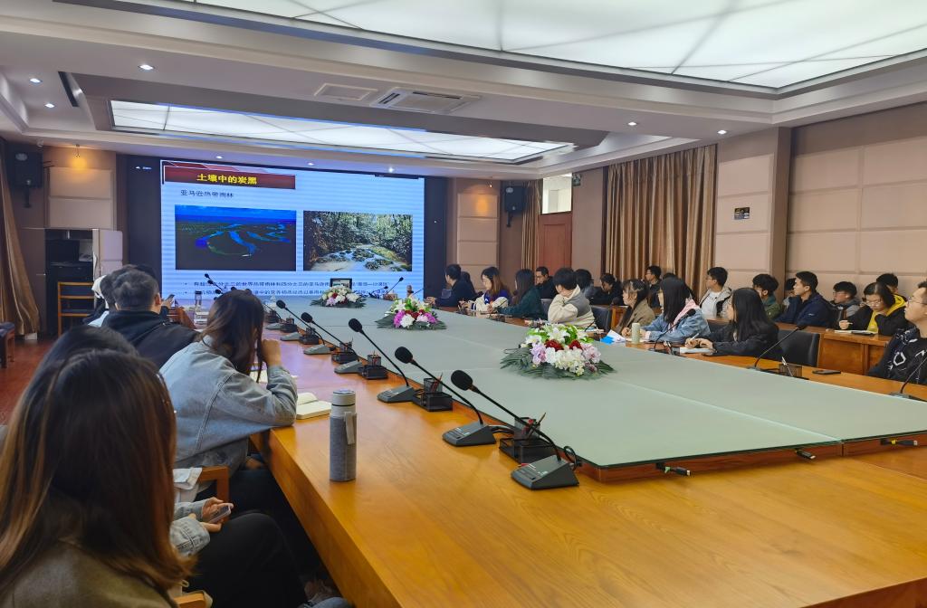 报告会上,潘波教授以土壤中的炭黑为研究背景,以热解碳材料的反应活性及其结构溯源为主题,主要讲述了热解碳材料生物炭的表观反应活性和生物炭降解对硝基苯酚的作用以及生物炭的应用和环境意义,指出生物炭在污染物降解、水处理高级氧化系统、产甲烷以及金属的氧化还原反应中的应用前景。报告会后,潘波教授与师生展开了热烈的讨论,对老师和同学们提出的问题进行了一一解答。