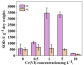 研究发现,Cr(VI)胁迫环境对球等鞭金藻生物量,叶绿素a和可溶性蛋白含量产生影响,其浓度为0.5mg/L时,可促进生长、叶绿素a和可溶性蛋白的合成增多。浓度由1.0mg/L增加至10.0mg/L时,微藻的生长受到抑制,叶绿素a和可溶性蛋白的合成相应减少。并引起微藻细胞结构的破坏。