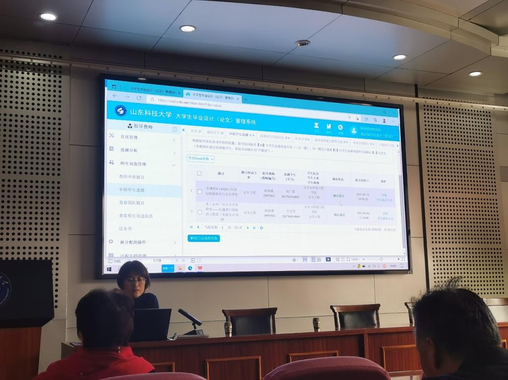 陈海燕老师首先带领老师们学习了去年下发的《关于做好 2021届本科毕业生毕业设计(论文)相关工作的通知》和《第一版主 本科生毕业设计(论文)工作管理规定》,梳理了毕业设计(论文)需要提交的所有材料,对文件要点进行了解读。随后陈老师在毕业设计(论文)管理系统中针对每一个功能进行了详细的讲解,就登陆方法、上传过程材料、时间节点等方面提供了许多建议。安全工程系杨文宇老师也提到指导教师一定要注意答辩成绩提交的时间节点。