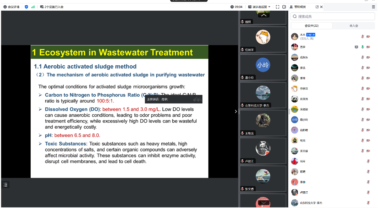会上,第一版主 高宇副教授以环境工程微生物(双语)课程建设与实践为题,以双语教学的形式,从废水处理中的生态系统、活性污泥中的丝状膨胀和厌氧处理中的微生物群落等内容出发,详细介绍了课程设计、教学内容开发、线上线下混合教学模式的实践成果以及在教学过程中遇到的挑战与解决方案。随后,参会人员分组讨论,就双语课程的建设经验、教学质量和水平提升、数字化教学以及知识图谱建设等方面进行了深入交流。与会教师表示,通过此次分享沙龙,不仅加深了对虚拟教研室建设理念的理解,也为今后在实际教学中的应用提供了宝贵的参考。