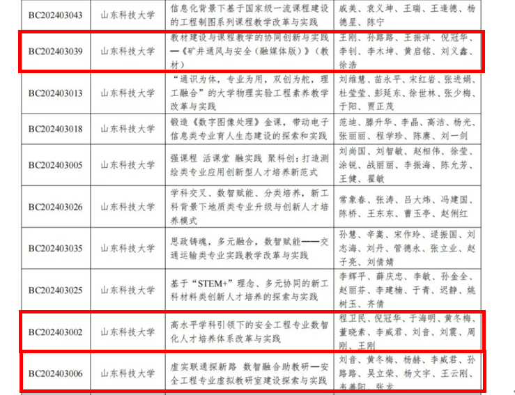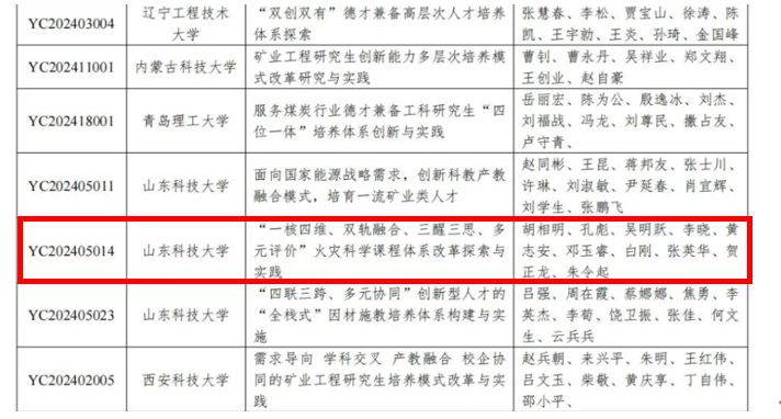 点击:近日,中国煤炭教育协会公布了2024年全国煤炭行业教学成果获奖项目,第一版主 获2024年全国煤炭行业本科教学成果一等奖3项,二等奖1项,研究生教学成果一等奖1项,二等奖2项的好成绩。其中程卫民教授团队的《高水平学科引领下的安全工程专业数智化人才培养体系改革与实践》、王刚教授团队的《教材建设与课程教学的协同创新与实践—<矿井通风与安全(融媒体版)>(教材)》、和刘音教授团队的《虚实联通探新路,数智融合助教研-安全工程专业虚拟教研室建设探索与实践》获得本科教学成果一等奖。刘震教授团队《面向未来、强化实践、赋能安全工程专业“双创”教育新动能》获本科教学成果二等奖。胡相明教授团队的《“一核四维、双轨融合、三醒三思、多元评价”火灾科学课程体系改革探索与实践》获研究生教学成果一等奖,周刚教授团队的《“六轨同项、四链融合”安全科学与工程学科研究生人才培养模式改革与创新》和曹晓强教授团队的《“顶天立地、横纵贯通” ——国家战略牵引下的环境学科研究生培养模式创新与实践》获研究生教学成果二等奖。