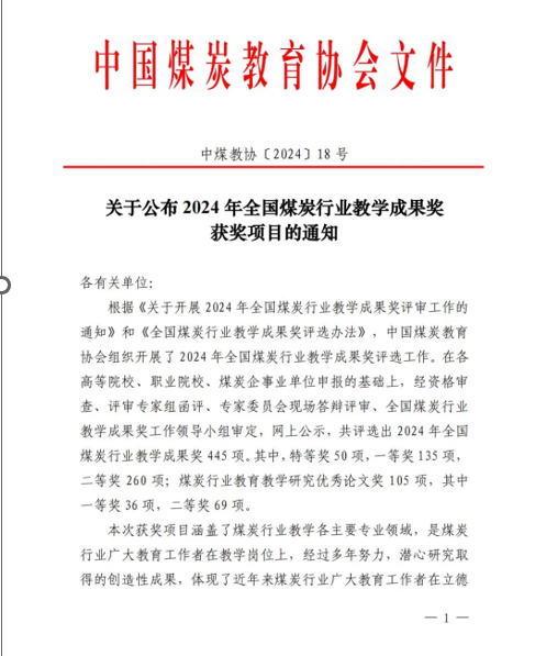 近日,中国煤炭教育协会公布了2024年全国煤炭行业教学成果获奖项目,第一版主 获2024年全国煤炭行业本科教学成果一等奖3项,二等奖1项,研究生教学成果一等奖1项,二等奖2项的好成绩。其中程卫民教授团队的《高水平学科引领下的安全工程专业数智化人才培养体系改革与实践》、王刚教授团队的《教材建设与课程教学的协同创新与实践—<矿井通风与安全(融媒体版)>(教材)》、和刘音教授团队的《虚实联通探新路,数智融合助教研-安全工...